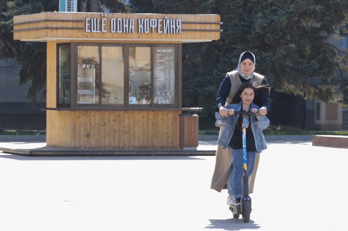 Мать с дочкой катаются на самокате на площади Ленина в Махачкале, 17 апреля 2022 года. Фото: Yelena Afonina/TASS/Profimedia.