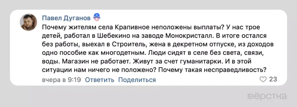 «Почему жителям села Крапивное не положены выплаты? У нас трое детей, работал в Шебекино на заводе „Монокристалл“. В итоге остался без работы, выехал в Строитель, жена в декретном отпуске, из доходов одно пособие как многодетным. Люди сидят в селе без света, связи, воды. Магазин не работает. Живут за счет гуманитарки. И в этой ситуации нам ничего не положено? Почему такая несправедливость?», — написал беженец из Крапивного Павел Дуганов.