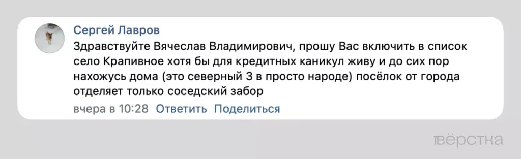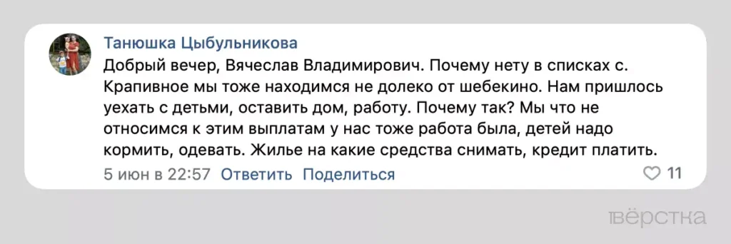 Практически все комментарии под постами губернатора Белгородской области Вячеслава Гладкова во «ВКонтакте» за последнюю неделю посвящены массированным обстрелам Шебекино и окрестностей. После 5 июня значительную часть из них оставляют жители сёл вокруг Шебекинского. В этот день Гладков опубликовал список из 38 сёл, посёлков и хуторов, жители которых могут претендовать на единовременную денежную выплату, кредитные и коммунальные каникулы.